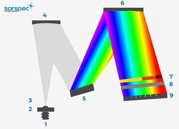 Sarspec 生产的光谱仪是高品质系统,配有铝合金光学平台,每个光学元件都经过彻底优化。光学平台内的光学元件采用对称 Czerny-Turner 配置组装,可显著提高光谱仪的灵敏度。Sarspec 光谱仪简单的形式由入口狭缝 (2)、准直镜 (4)、衍射光栅 (5)、聚焦镜 (6) 和探测器 (9) 组成。