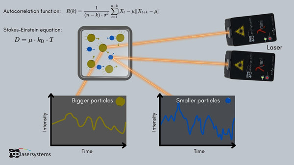由于布朗分子运动(分子/粒子在流体状态下的随机运动)导致粒子间的距离不断变化,因此会产生干涉,从而导致波动(散射强度的变化)。下图显示了大颗粒/小颗粒的波动情况。现在可以利用干扰来确定粒子的速度和所谓的扩散系数。自相关函数可用于计算颗粒参数,这些参数可用于利用斯托克斯-爱因斯坦方程确定颗粒的流体力学半径。这些结果可用于间接确定测量颗粒的摩尔质量。
