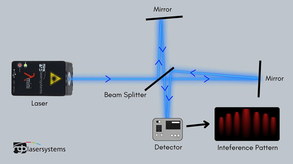 该图说明了迈克尔逊干涉仪的基本结构。干涉仪将光波分成两部分。然后,这两部分光波以不同的传播时间传播不同的距离。当它们相遇时,就会发生干涉。