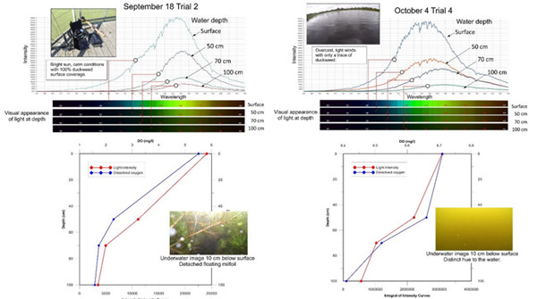 试验结果表明,光照强度与溶解氧浓度之间存在很强的相关性。图2展示了两个不同试验日期的光谱和溶解氧浓度的汇总图。图中标出了每个深度的光谱曲线,并用彩色分光镜条带直观地展示了该深度的光照情况。对每个深度的光谱曲线进行了面积积分,并与溶解氧浓度一起绘制,结果显示,随着光照强度的降低,溶解氧浓度也会降低。