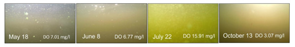 图 3. 2020 年下拉相机图像,显示光线和 DO 的季节性变化。