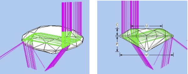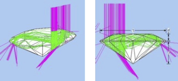 图 4、图 5 和图 6 展示了使用 GemCad程序计算的一些光线轨迹草图。模拟结果表明,这种行为取决于宝石的比例以及宝石刻面不同方向上的光线照射。