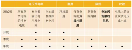 功能覆盖下表所有蓄电池维护标准所推荐的测试项目(国际电气和电子工程师协会 IEEE1188-2005)