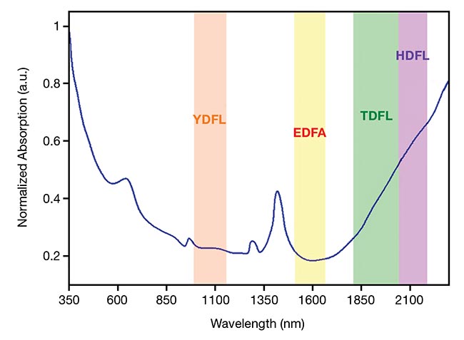 羟基吸收和激光发射机会带在石英光纤中(底部)。EDFA:掺铒光纤放大器;HDFL:掺钬光纤激光器;TDFL:掺铥光纤激光器;YDFL:掺镱光纤激光器。