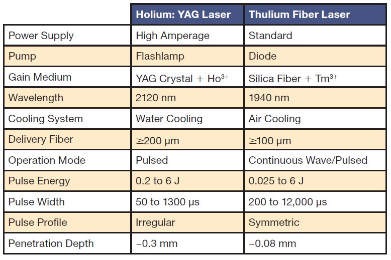 Holmium:YAG (Ho:YAG) 激光是泌尿科中最常使用的激光,因为它具有多用途能力,可以实现所需的切割和组织凝固。然而,尽管如此,其主要吸收带在1.9 µm的常用二极管并不存在。因此,这些激光器通常使用闪光灯泵浦——并且会产生大量的热废,因为激光晶体的泵浦效率不高。另一方面,TDF激光器可以使用商业二极管泵浦,与闪光灯相比,它们具有多个优点,因为它们可以在较低的功率下运行,并且不需要复杂的激光配置(见表)。