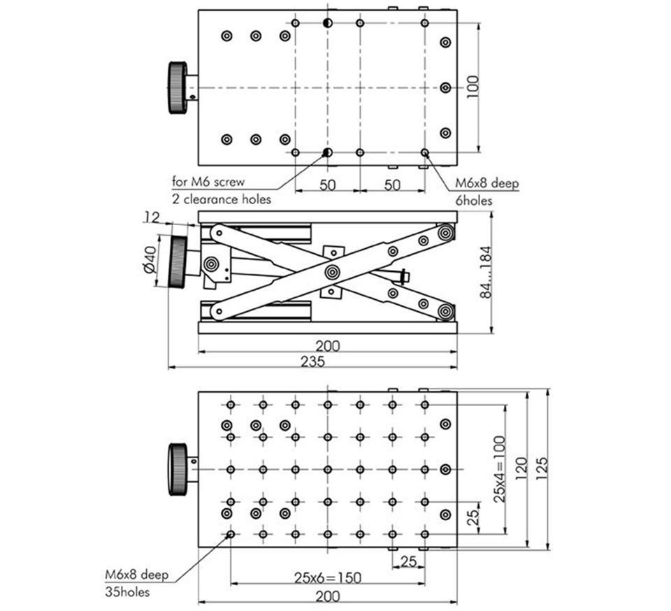 垂直平移台7VT188-20拥有我们独特的设计。它非常紧凑,可以平稳稳定地调节高度。它具有大的行程范围,并且支持大负载。移动时,平台保持与底座平行。导螺杆以不同的角度作用,因此载物台的分辨率随位置而变化。平台有一排间隔25毫米的M6孔。底座有六个M6孔和两个直径6.5的孔。材料是黑色阳极氧化铝。