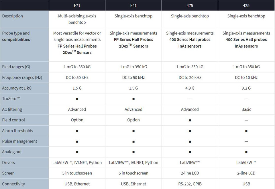 高斯计和特斯拉姆计可以测量直流和交流磁场,并控制直流磁场。为此,高斯计需要一个合适的霍尔探头。所提供的系统包括单轴和多轴系统,非常适合工业和科研应用。高斯计为台式设备。新型Cryotronics F71 和 F41 测试仪配备 FP 系列探头,是在各种应用中测量磁场的好选择,在精度、便利性和可靠性方面都达到了新的水平。