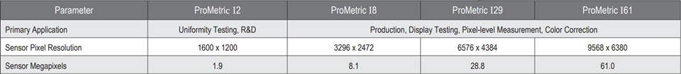 ProMetric I 成像测色计专为满足显示器、背光组件、光源和设备组件的大批量生产需求而设计。ProMetric I 采用基于标准 CIE 色彩匹配功能的三基色滤光片技术,可为实验室测试和生产级检测提供高度准确的色彩和亮度测量。ProMetric I 采用科学级图像传感器设计,有一系列高分辨率可供选择。这些传感器可对显示器(LCD、OLED)进行像素级测量,对背光键盘和面板进行字符间和字符内亮度测量,以及对灯具或大型 LED 阵列中的 LED 亮度和色彩进行准确测量。