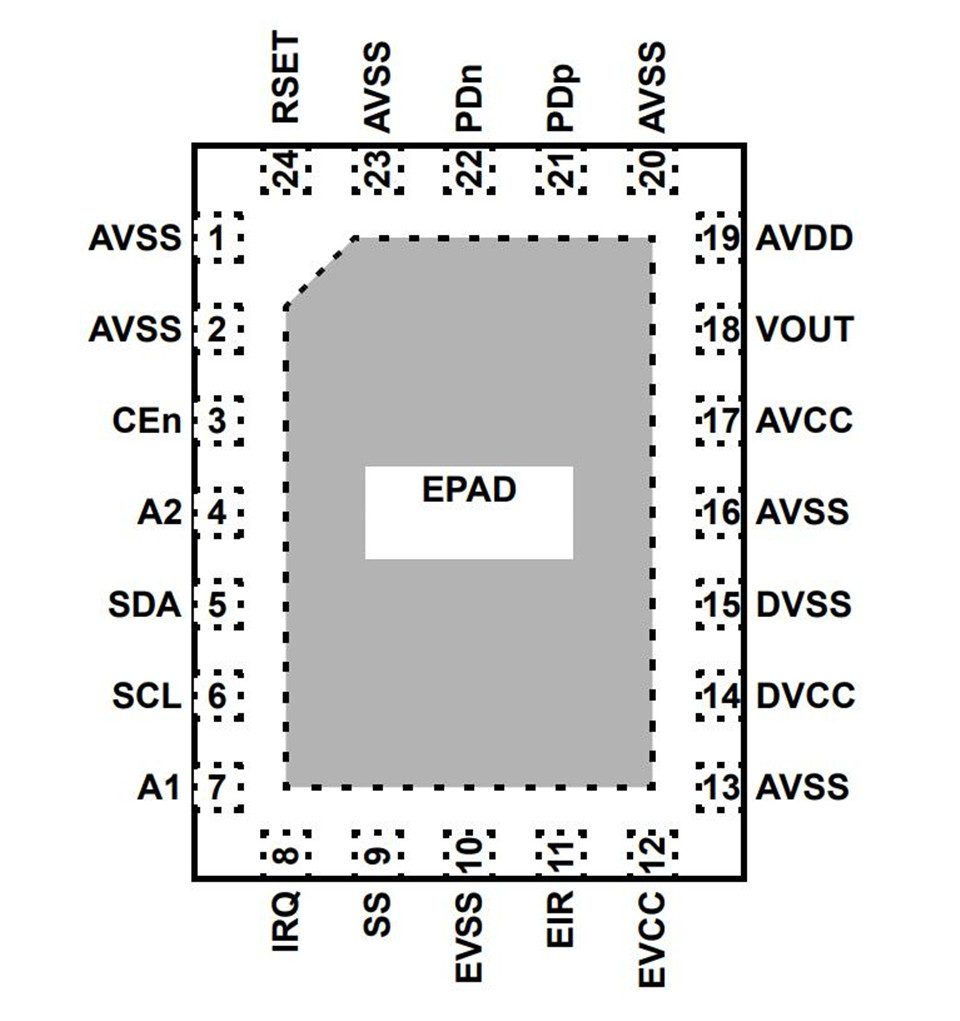 24 RSET 设置芯片偏置电流。与 10kQ 电阻器连接,1% 至 AVSS 接地。