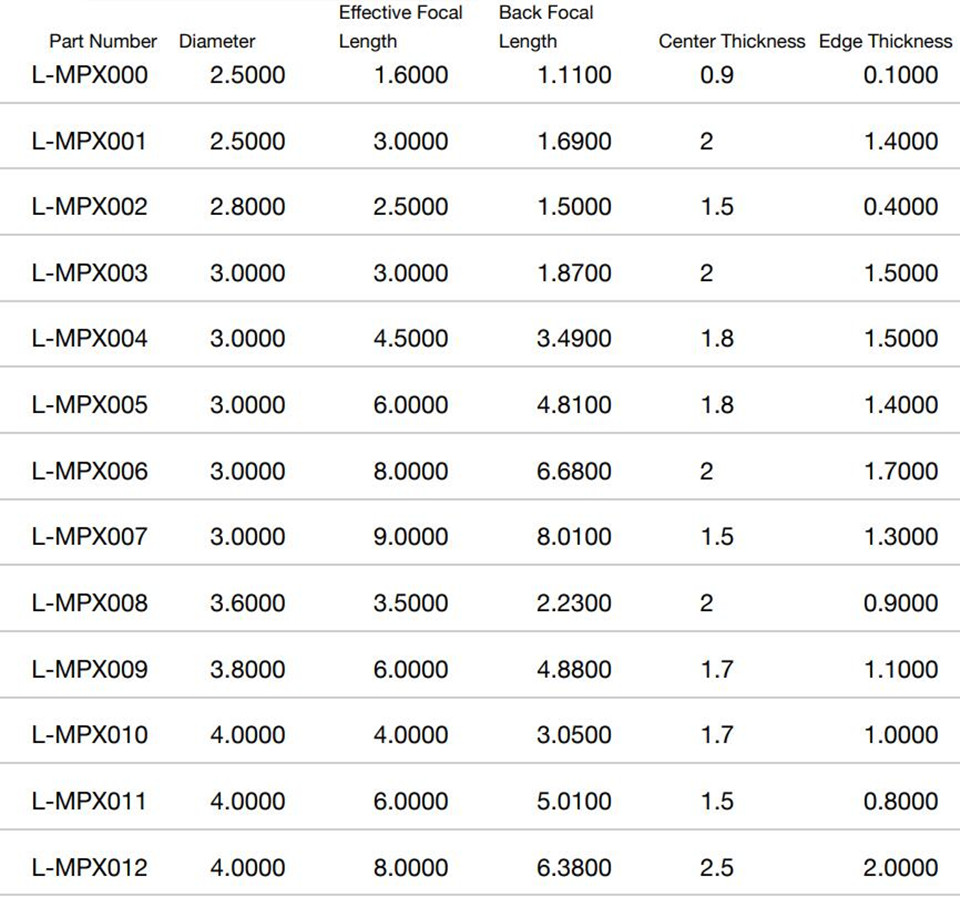 平面凸透镜,这种镜片有一个平面和一个凸面。它们具有正焦距,用于会聚或聚焦入射光。它们适用于无限共轭系统。它们可用于许多不同的光学系统,如放大镜、望远镜、准直仪、聚光器和成像仪器。为获得更好的光学性能,凸面应始终朝向入射光。这些微平凸透镜与标准平凸透镜相似,但直径更小,是轻型和紧凑型仪器的选择。
