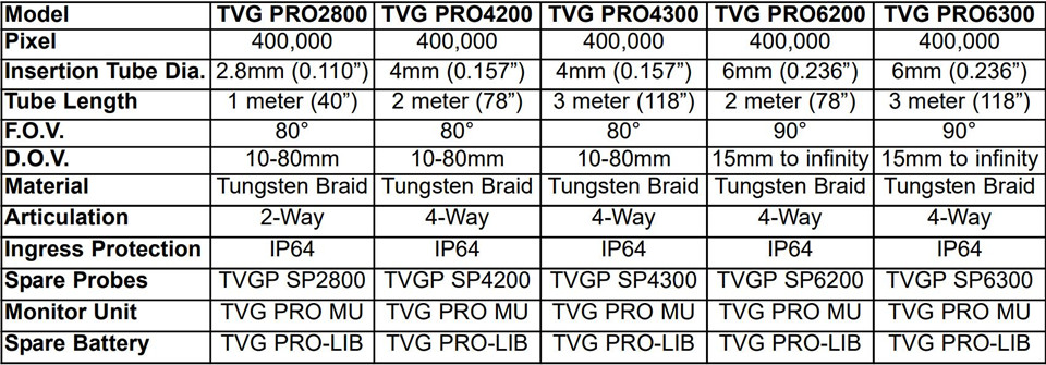 TVG PRO 系列可视镜是一款高品质、高性价比的工具,可满足您所有的远程视觉检测需求。新的创新模块化系统允许您更换不同直径和长度的插入管。只需一个视频控制手柄,这些探头就能实现 360 度完整的铰接,使用不同的直径和长度。有 5 种不同型号,3 种直径尺寸和 3 种长度可供选择。直径有 2.8 mm、4 mm和 6 mm,长度有 1.5 米、2 米或 3 米。TVG Pro 系列视像镜采用新型互换电缆设计。一个单体可与 2.8 mm、4 mm或 6 mm电缆匹配,5 秒钟内即可快速更换。