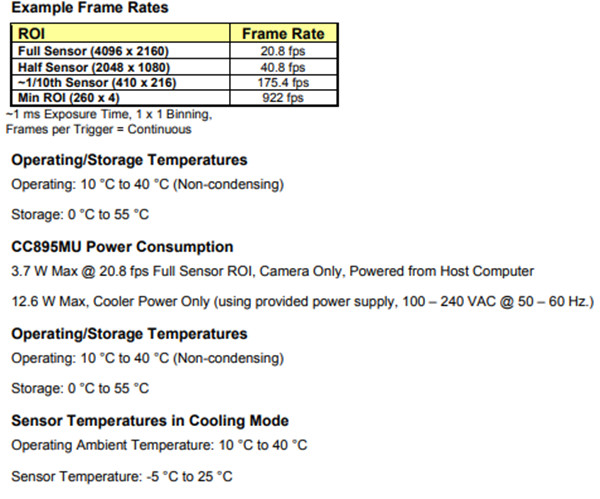 CC895MU密封冷却型Kiralux相机的大型外部散热器内具有半导体制冷室,可主动冷却传感器并减少暗散粒噪声。与被动冷却的CS895MU相机相比,这样可优化暗电流性能10倍,并且可在更长曝光时间下提高性能。我们建议将此相机用于需要曝光时间大于500 ms的弱光应用。对于需要曝光时间小于500 ms的亮光应用,一般被动冷却CS895MU相机就足够了。