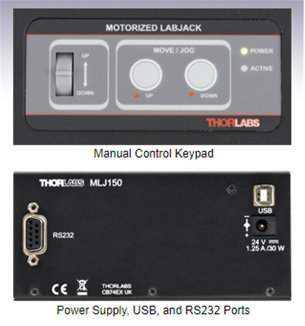 MLJ150(/M) 5.83英寸 x 5.16英寸(148 mm x 131 mm)的顶部平台上有二十五个1/4"-20(M6) 安装孔。此处还可以看到用于手动控制的键盘。