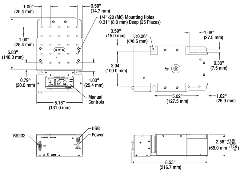 该位移台具有良好的刚性和平台平行度。顶板有二十五个1/4"-20(M6)螺孔,孔深0.31英寸(8.0 mm),而底板有沉头孔槽,用于将位移台安装到光学面包板。该装置通过输出为100 - 240 VAC且符合当地区域的专用电源供电。请先将电源装置(PSU)连接到位移台,然后再将PSU连接到电源插座。位移台还附带一根用于连接PC的USB电线。