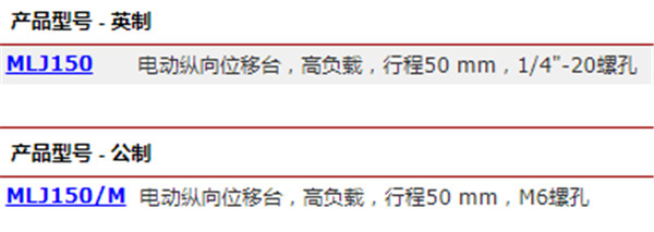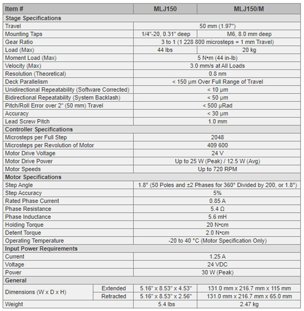MLJ150(/M)电动纵向位移台由步进电机驱动,可实现平滑的线性高度调节,调节范围为max.50 mm。集成的电子控制器可实现本地控制或通过我们的软件进行CPU控制。该位移台有一个十分坚固、高度可调的平台,非常适合安装需要调节高度的光机子组件。这个平台尺寸较大(5.83英寸 x 5.16英寸),能够将20 kg的负载以3 mm/s的速度移动。此外,它还装有防护装置,以防卡住手指等其他障碍。这些特性使其非常适合用作重载实验室升降台。