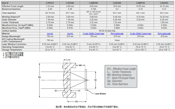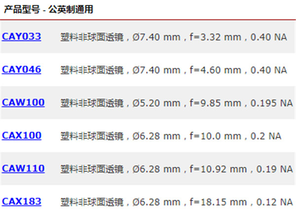 THORLABS塑料非球面透镜CAY033