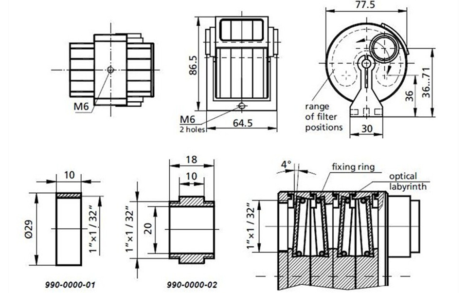 当使用高灵敏度的光电探测器(如CCD、光电倍增管等)时,需要完全消除侧面背景照明,则使用闭式可变轮衰减器990-0704。您可以单独订购标准连接适配器990-0000-01和990-0000-02。自定义适配器也可用。