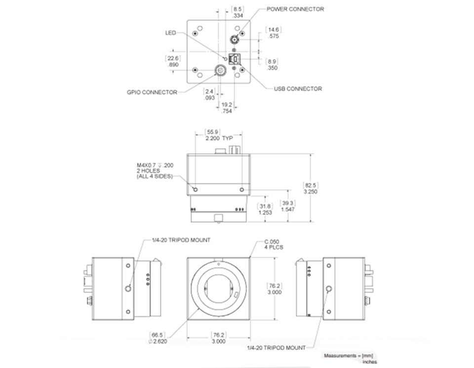 • Hirose GPIO连接器,带电源输入、1个光学隔离输入、1台光学隔离输出和2个软件可配置双向IO,用于控制外围设备和同步照明