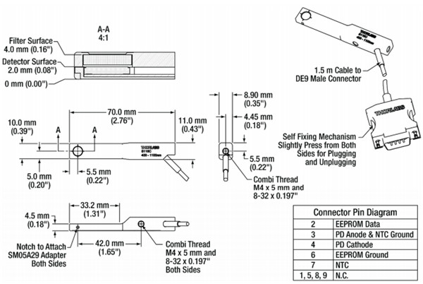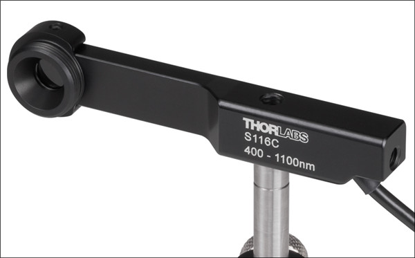 SM05A29转接件(单独购买)可通过两个0.05英寸(1.3 mm)六角固定螺丝安装到S116C功率探头,以安装光纤转接件、挡光片、滤光片或其它SM05螺纹(0.535"-40)光机械件或光学元件。安装在S116C功率探头上的转接件如下图所示。