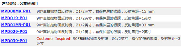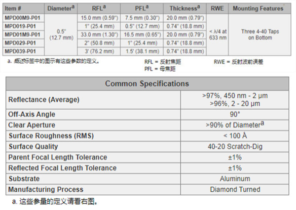 聚焦光束和准直光束的角度(离轴角)为90°。准直光束的传播轴应与基底垂直,从而实现理想的聚焦效果。抛物表面经过金刚石切削处理,镀有一层带保护层的银膜,可以在450 nm - 2 µm的波长范围内提供>97%的平均反射率,在2 µm - 20 µm的波长范围内提供>96%的平均反射率。尽管镀保护膜可以保护银免受污染,但还是需要防止空气过于潮湿。