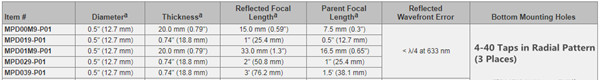 这里出售的OAP反射镜由铝基底制造。每个反射镜的底部都有三个呈三角形排布的螺纹安装孔和一个用于安装转接件对准孔。非光学表面经过阳极氧化发黑处理,且用激光刻有产品型号,方便识别。