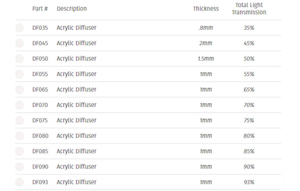 MidOpt 提供玻璃和亚克力两种选择。可提供各种厚度和特定的透射水平(从 5% 到 93%)。常见的扩散器类型包括磨砂玻璃、模压/纹理亚克力、薄塑料薄膜、闪烁或实心乳白玻璃、模压/纹理玻璃和衍射扩散器。后者的成本通常要高得多,但可用于控制 LED 的光输出,以提供更准确的空间配置和强度曲线,同时将背向散射造成的光损失保持在低水平。