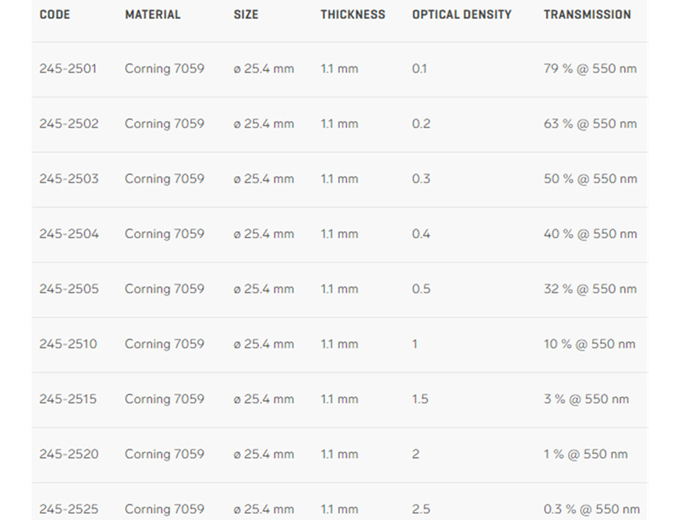 • Corning 7059 玻璃中性密度滤光片可提供 400 纳米到 2000 纳米的均匀光谱衰减。