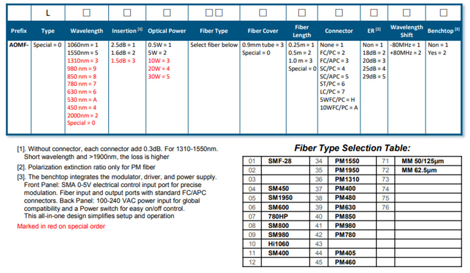该 AOMF 系列光纤声学调制器经过优化,具有 80MHz 谐振频率,光损耗低 <1dB,为通过光纤传输的激光的快速幅度调制提供解决方案,并且具有方便的 0-5V 控制信号。我们提供独特的功能,包括插入损耗低 <1dB、光功率处理高达 50W、开/关比高 >60dB、偏振消光高 >30dB、波长选择范围宽(350 至 2400nm)、与所有光纤类型兼容,以及具有竞争力的成本。该设备通常是不透明的,当满足声学布拉格衍射条件时变为透明。它本质上会产生正波长频率偏移,尽管可以特别订购负偏移。这些调制器通常用于传感器、光纤激光系统,以及作为短脉冲、高重复率光纤激光器的脉冲选择器。