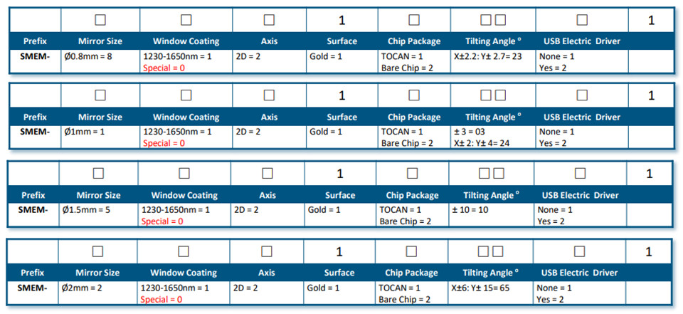 SMEM 系列扫描双轴(tip倾斜)和单轴倾斜 MEMS 镜具有二维和一维光束转向功能。SMEMS 扫描速度更快、功耗低、精度高、重复性好。MEMS 由单晶硅制成,镜面平整光滑,表面镀有高折射率金薄膜。SMEM 采用密封包装,并配有光学窗口,可连续工作 25 年。为方便评估,还提供驱动电路板。