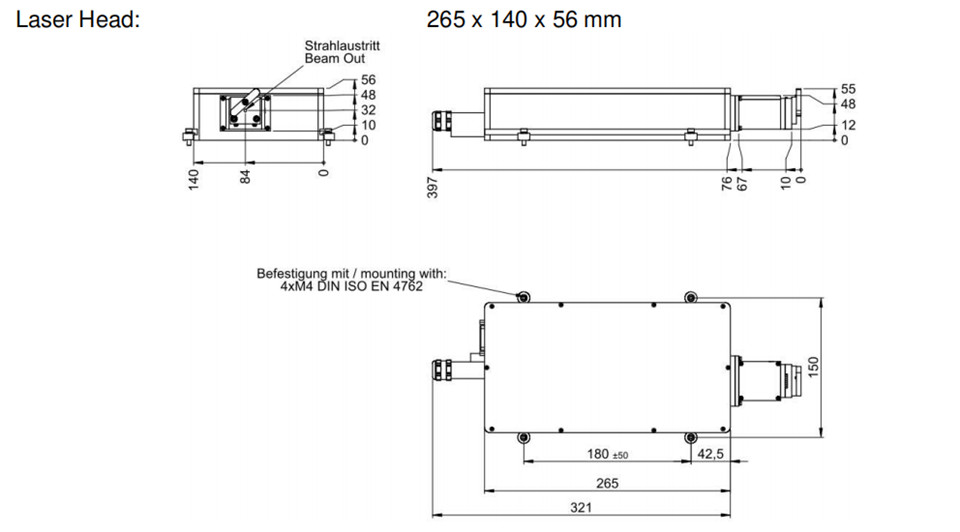 激光头尺寸:56 x 140 x 265 毫米(高 x 宽 x 长)