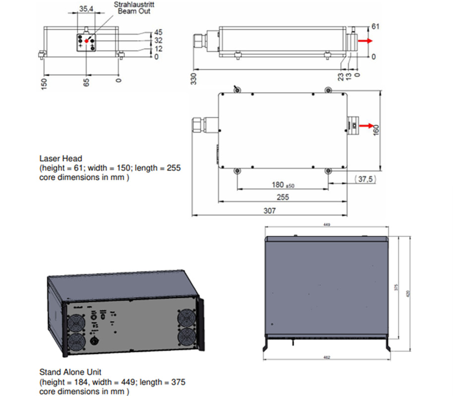 激光头尺寸:61 x 150 x 330 毫米(高 x 宽 x 长)