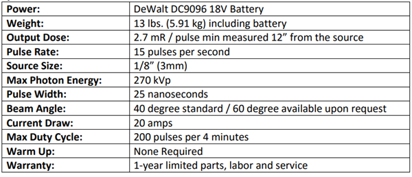 XRS3 是我们用途最广泛的装置,因为它在紧凑的包装中提供了良好的穿透能力。紧凑的设计具有电池组、坚固的玻璃管、高压头和电子控制的单个包装,重量不到 13 磅。操作员可以在方便时购买备用电池组,因为 XRS3 由与为 DeWalt 无绳工具供电的相同市售电池组供电。XRS3 与 XR200 共享相同的电子控制和电池,这增强了两种型号的多功能性。