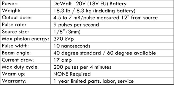 XRS4 重 19 磅,明显比其他 Golden Engineering 发电机更大更重。一台 370 kV 发电机可以穿透超过 1.5 英寸的钢材,重量不到 25 磅,但按照行业标准仍然被认为是非常便携的。