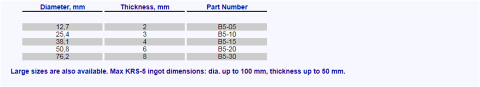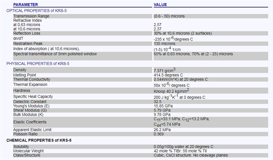 材料KRS-5 - 在 0.6 微米(红色,可见光)到 50 微米(远红外)的宽光谱范围内透明。KRS-5 晶体材料用于 KRS-5 棱镜、IR KRS-5 窗口和 KRS-5 透镜,其中需要 (0.6 - 40) 微米范围内的透射率。 KRS-5 通过密封安瓿 Stockbarger 技术结晶。 KRS-5 材料具有随时间冷流和改变形状的趋势。 KRS-5晶体仅微溶于水,但可溶于酒精、硝酸和王水。