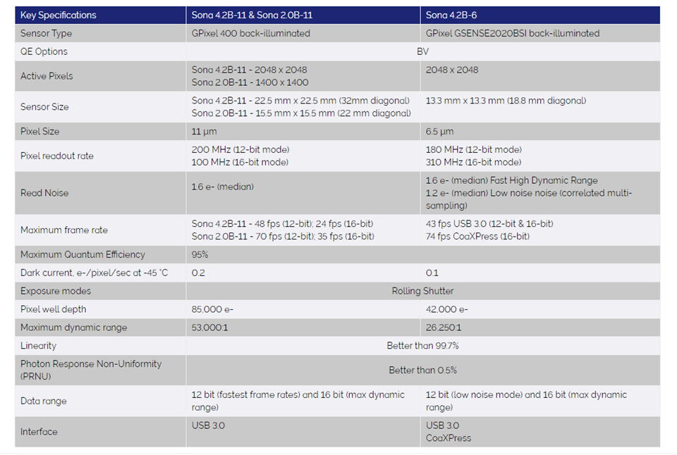 Sona 是 Andor 新的高性能 sCMOS 相机系列,专门用于生命科学成像应用。新的 Sona 4.2B-6 型号提供灵敏度、速度和分辨率的平衡,可在许多应用中实现高成像性能。具有 6.5 µm 像素的 4.2 兆像素格式非常适合广泛使用的 40 倍和 60 倍放大倍率。旗舰型号 Sona 4.2B-11 是灵敏度和视野的解决方案,提供32 毫米视野。所有 Sona 型号均采用新的背照式 sCMOS 技术,具有 95% 的量子效率 (QE)。两种型号均支持 SRRF-Stream+ 实时超分辨率技术。