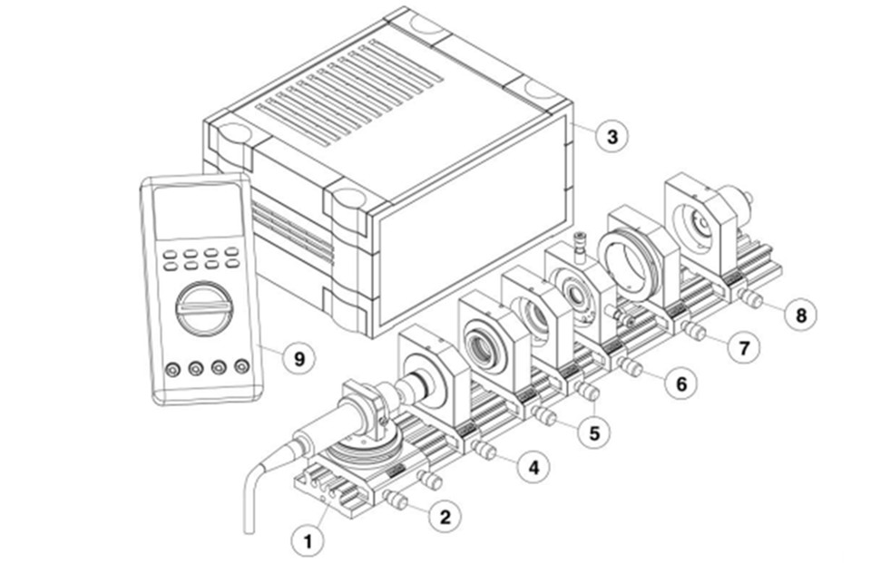 安装在旋转装置上,测量激光二极管发射的空间分布。光束整形光学元件可以准直激光束并修改其轮廓。为了确定阈值电流和斜率效率,测量了二极管的相对输出功率与注入电流的关系。通过Nd:YAG晶体的吸收,评估了芯片温度和注入电流对激光波长的依赖性。偏振器探测了偏振状态与二极管电流的关系。二极管的电流、温度和电流调制可通过集成光电二极管放大器的多功能控制器进行调节。