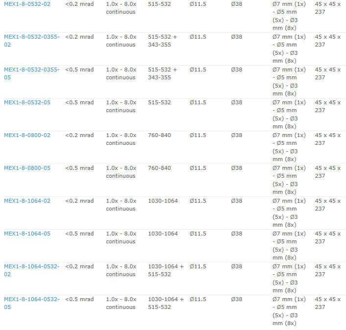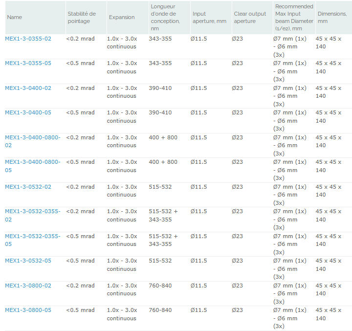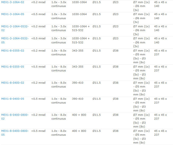 电动可变激光束扩展器MEX系列用于扩大激光束直径并调节发散角。标准或定制型束扩展器采用独特的机械闭环滑动透镜设计,确保高指向稳定性与min尺寸。这些可变倍率(变焦)束扩展器和缩束器专为特定波长设计,每种型号均具备电动发散角调节功能。
